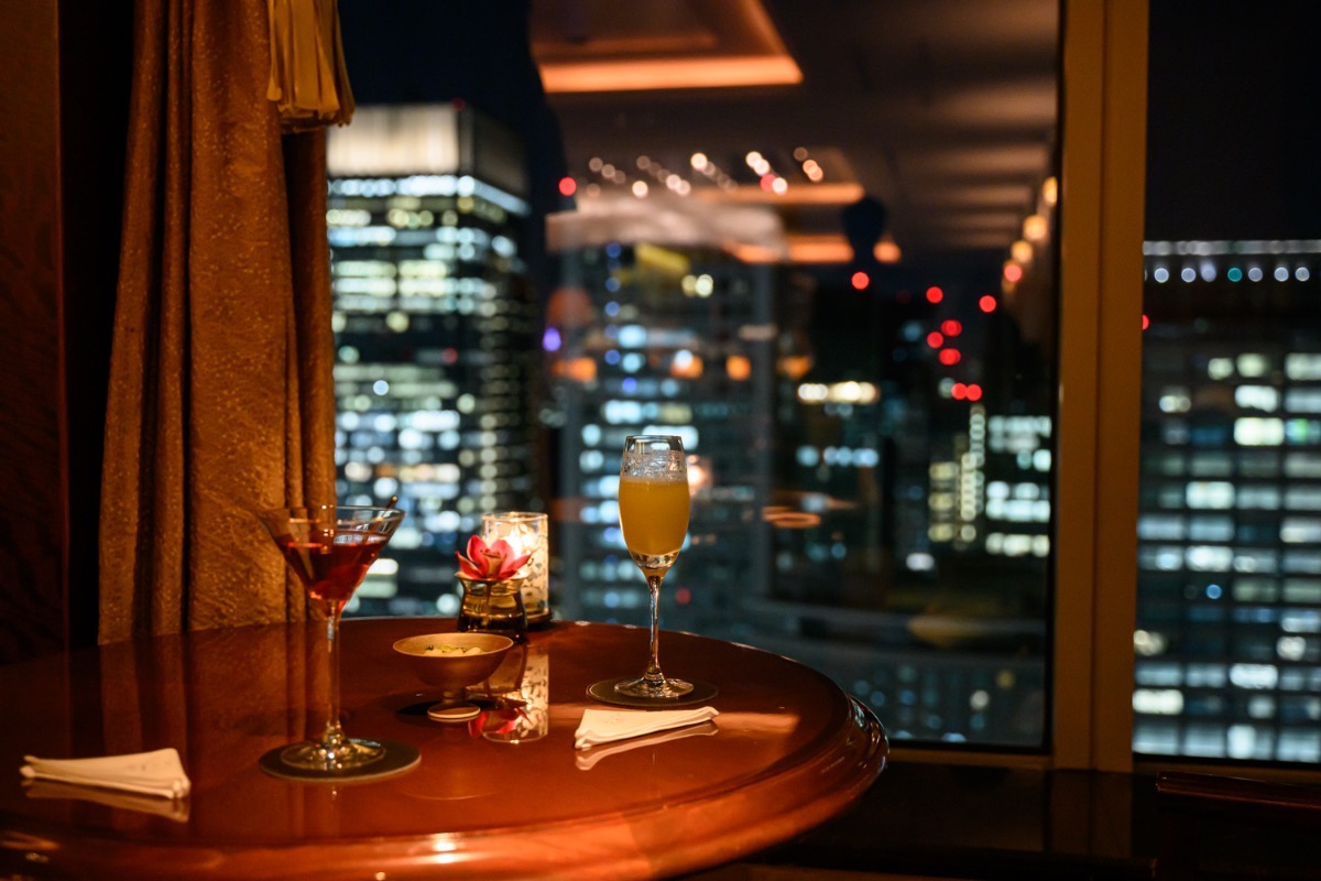 おでかけからホテルに戻って客室へ帰る前に、28階にあるバータイムの「ザ ・ロビーラウンジ」で一杯。こちらのシャンデリアもエントランスと同じようにイチョウの葉のモチーフ。星くずのようなきらめきがバーカウンターを華やかに照らすことで、窓際のテーブル席のしっとりと落ち着いたムードが際立つようです。