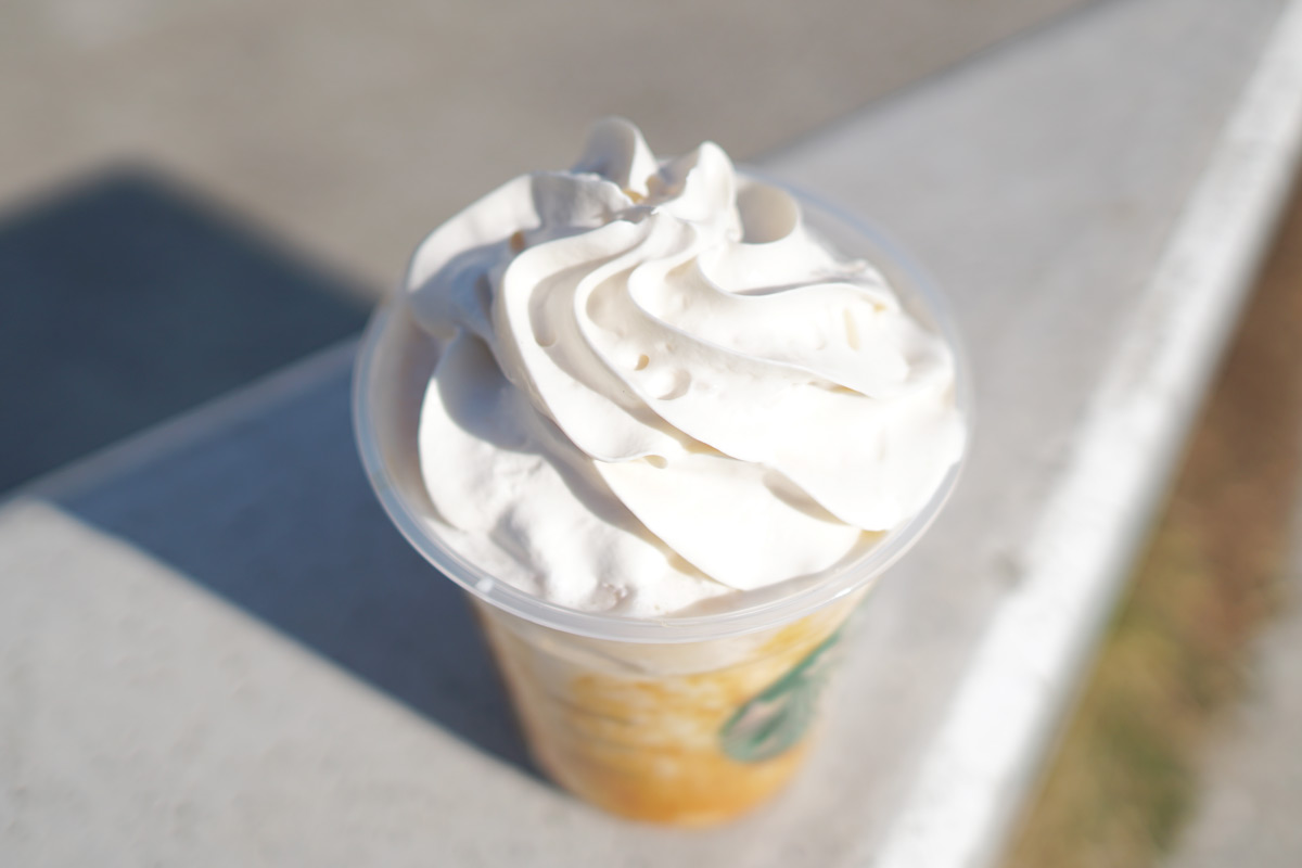 「キャラメリー ミルクコーヒー フラペチーノ®」に使われているバニラコーヒーホイップクリームはノンホイップと少なめは選択できますが、残念ながら多めカスタムはできません。