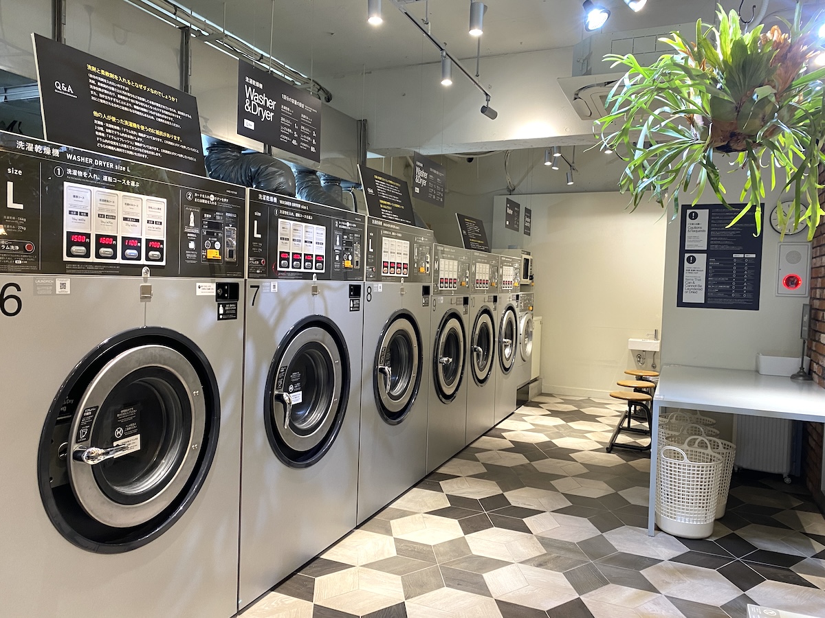 カフェには24時間使用できるセルフランドリーが併設。ランドリーの床はタイル張りで、グレーを基調とした清潔感のある内装です。おしゃれな雰囲気から雑誌やMVなど撮影に使用されることもあるそう。洗濯乾燥機が5台、乾燥機は10台。
