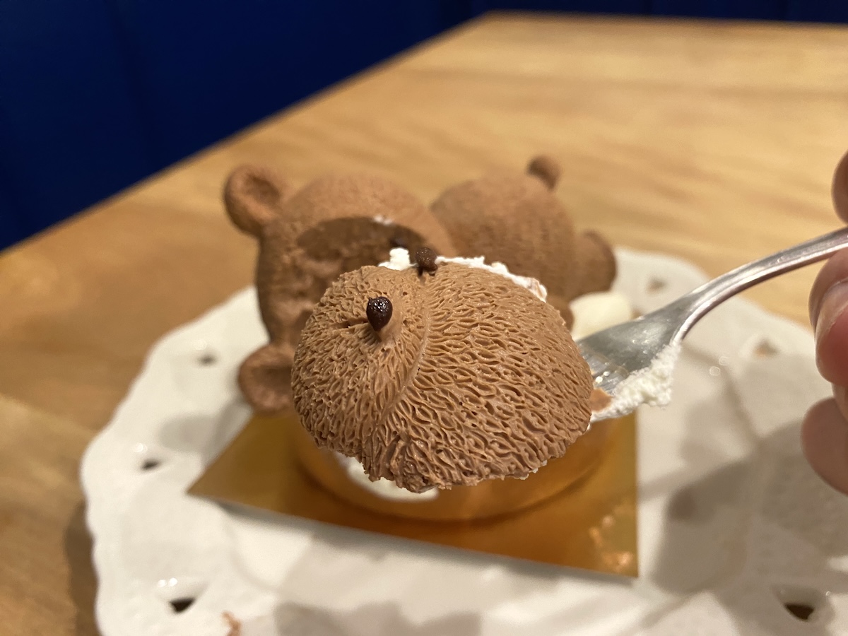 「クマさんごめん!」と心の中でつぶやきながら、ひと口。ロールケーキはしっとりとしていて、生クリームの上品なミルク風味が口いっぱいに広がります。チョコレートムースは濃厚ながらも、くどくない味わいなのでぺろりと食べられました!テイクアウトも行っているので、家族や友達へのおみやげにしたら喜ばれそうです。