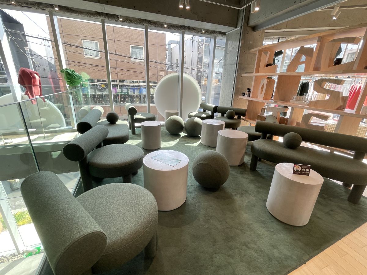 飲食スペースはテニスコートをイメージした芝を彷彿とさせるデザインを採用。ボールの形をしたボールは椅子としても使えます。ショッピングのひとやすみにぴったりな、リラックスできるエリアです。