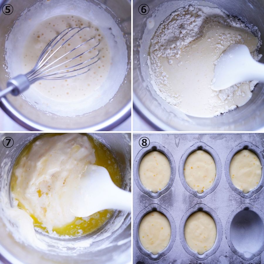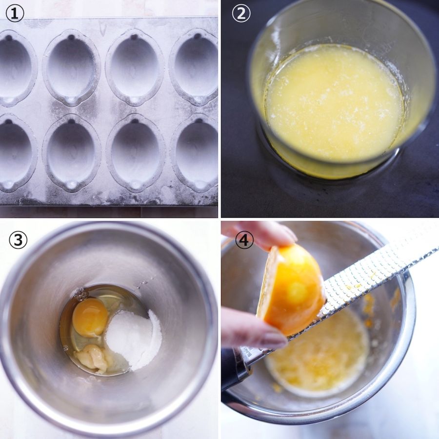 ①レモン型に薄く無塩バター(分量外)を塗り、強力粉(分量外)をはたいて、冷蔵庫で冷やしておきます。