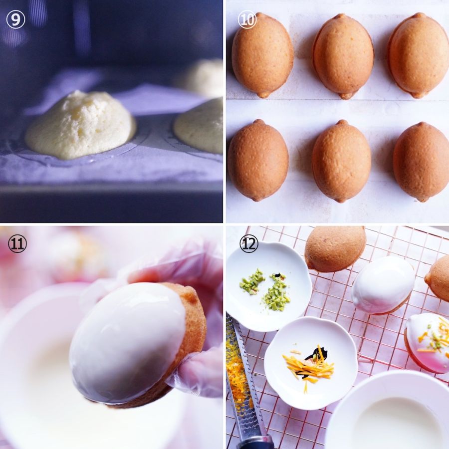 レモンのシロップ漬けをのせて170℃のオーブンで20分焼き、仕上げにレモンアイシングをかけておめかし。