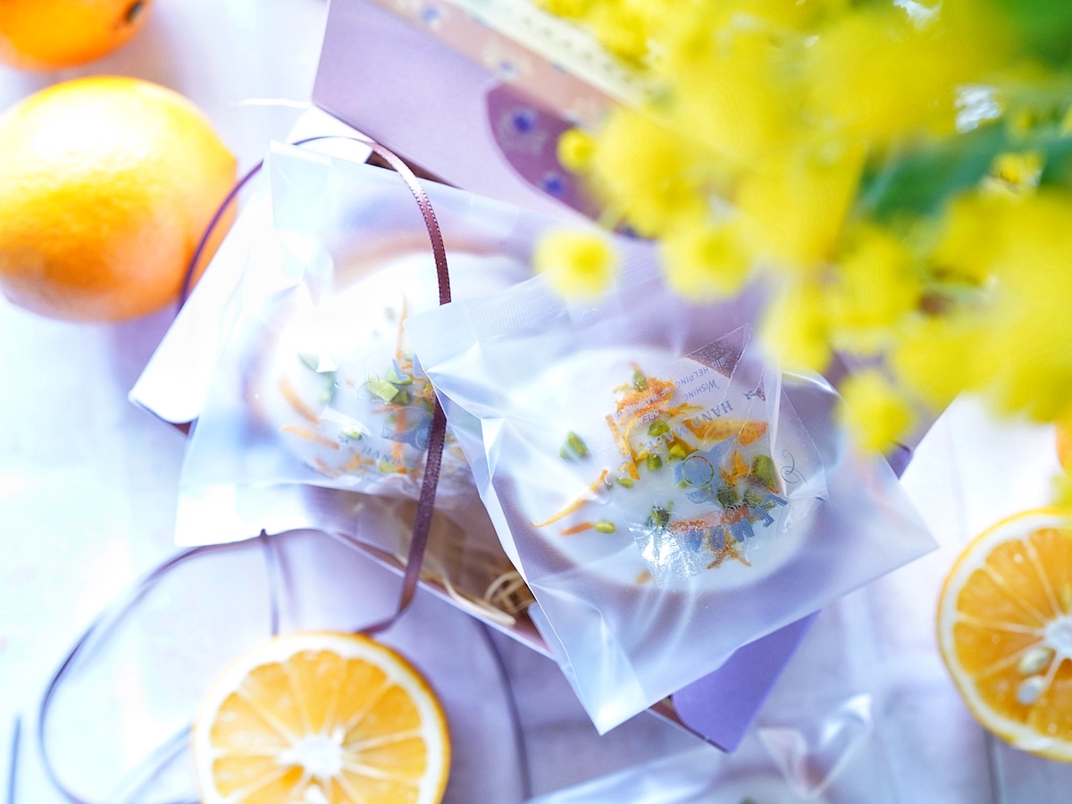 レモンケーキがとてもかわいいので、半透明の袋に入れてシンプルなラッピングに。透明のレモンのシールを貼りました。