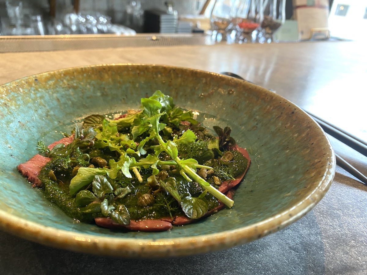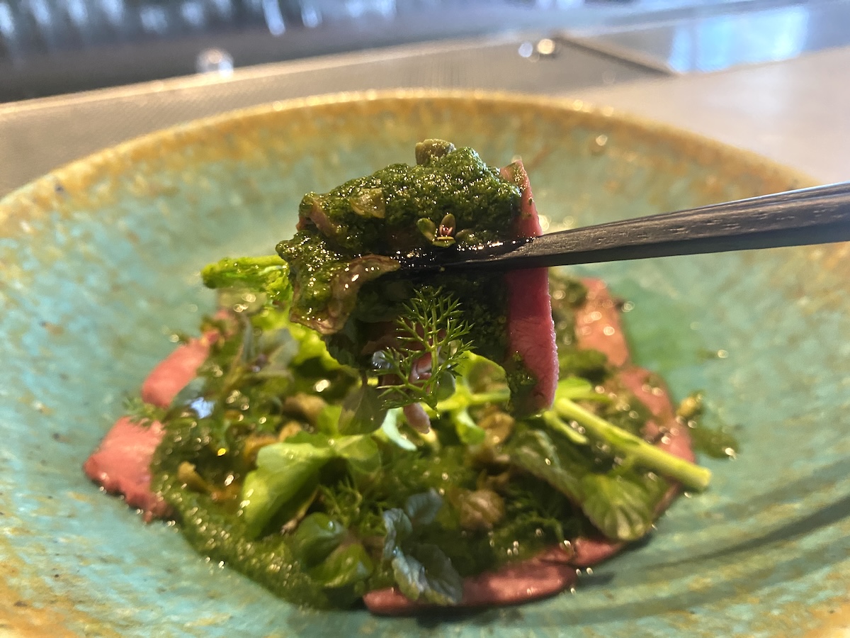 そんな「Herb&Citrus Lemon Sour」と合わせてオーダーしてほしいのが「牛ハツのカルパッチョ サルサヴェルデ」1600円。時間をかけて低温調理した牛ハツにサルサヴェルデとよばれる、パセリやフェンネルなどのハーブを鮎の魚醤とオリーブオイルでまとめたソースをかけた上品なひと品です。