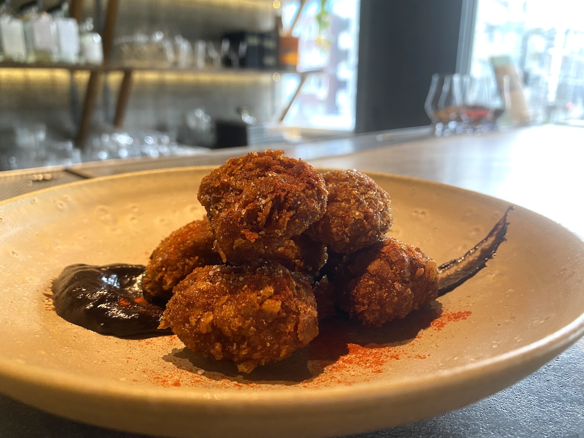 外は、スナック感覚で食べられるほどにサクサクと軽い食感で中のお肉はとてもジューシー。鶏もも肉のなかでもこだわりの部位を使用しているそう。そのままでもおいしいのですが、ソースをつけると甘辛さだけでなく、ナッツの風味とコリコリとした食感が加わってガラリと味わいが変化します。「TOKYO LIBRE」と楽しむのであればソースと合わせるのがおすすめです。