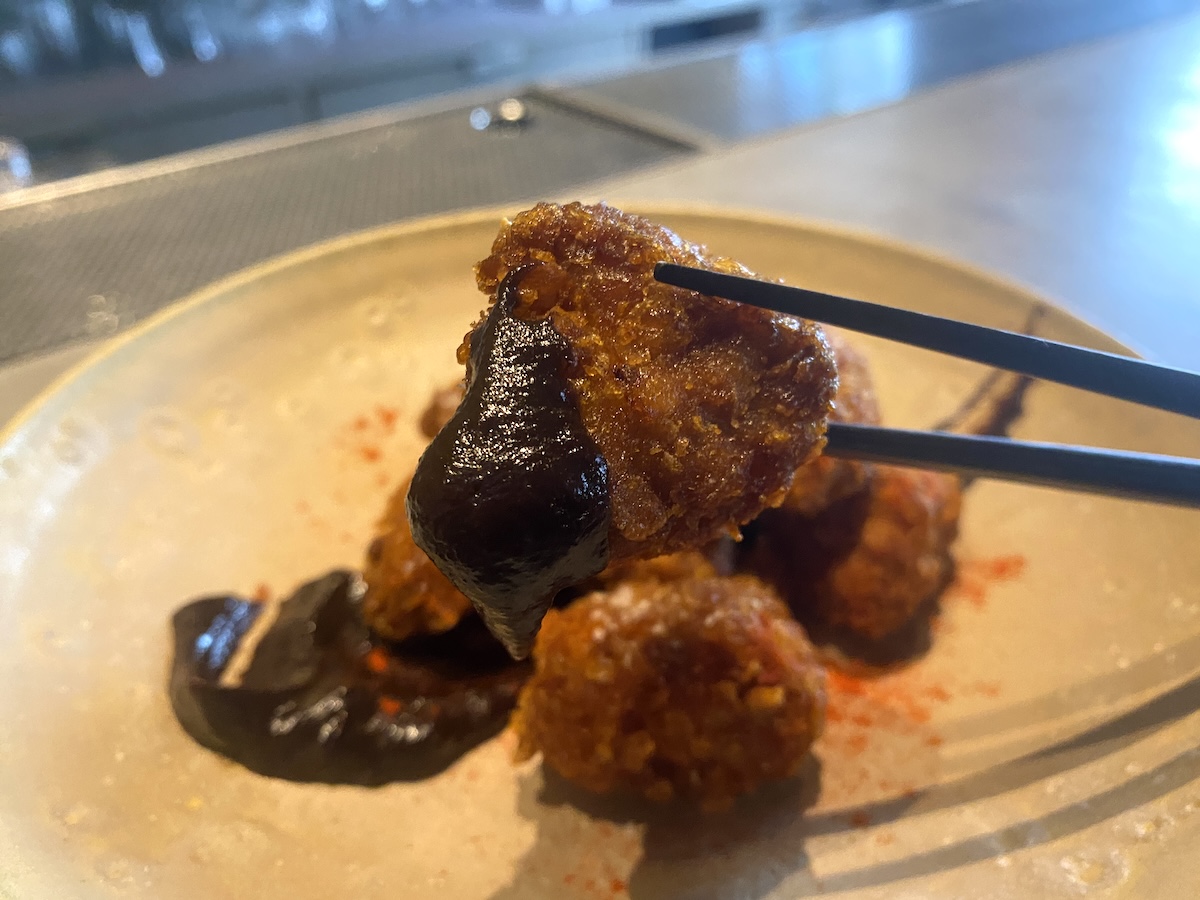 一般的な唐揚げと違い、衣に米粉とコーンフレークを使った唐揚げ。その上には、黒ニンニクやリンゴ、ヘーゼルナッツなどを加えた甜麺醤(てんめんじゃん)ベースの甘辛いソースがかかっています。