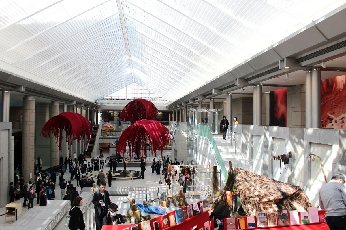 入り口から最初に目に入る「グランドギャラリー」の展示チャプター『いま、ここで生きてる』は、まるでキャンプ場のような賑わい。その姿は、自然に囲まれたキャンプ場でもあり、人々が身を寄せ合う難民キャンプでもあり…。あらゆる非常事態を前にしたアーティストたちの思考が作品になって表現されている空間です。