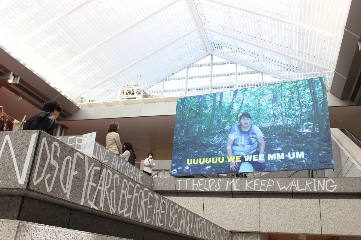 「グランドギャラリー」内に常に流れているビデオは、ウクライナのアーティストグループ「オープングループ」の映像。ロシアによるウクライナ侵攻にともなってリヴィウの難民キャンプに逃れた人々に取材したもので、音によって兵器の種類を聞き分けた上で、いかに行動するべきか、というマニュアルのもと、その武器の音を口で再現する人々の様子をまとめています。生きるために新たな知識が必要となったウクライナの現実が生々しく伝わってくる作品です。