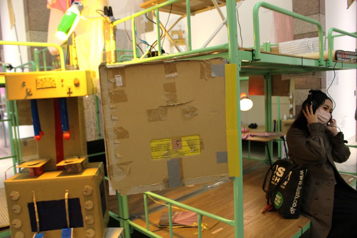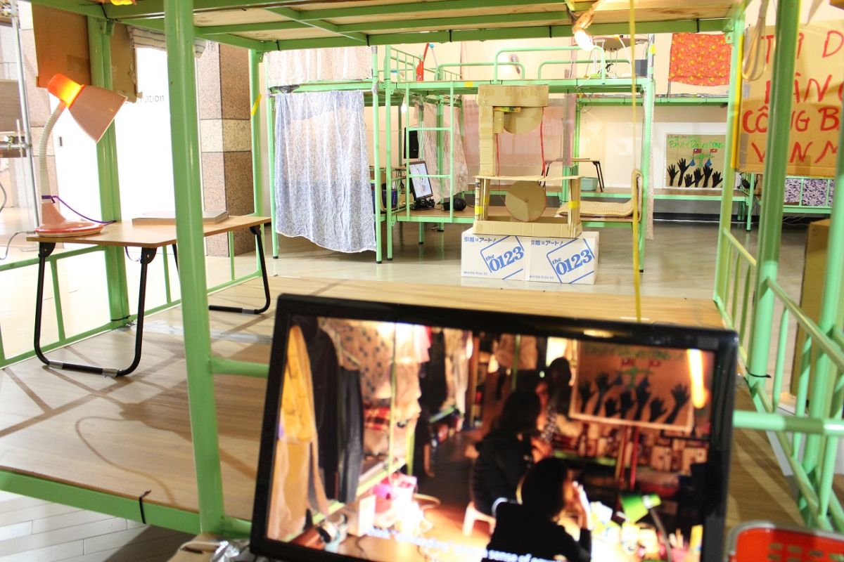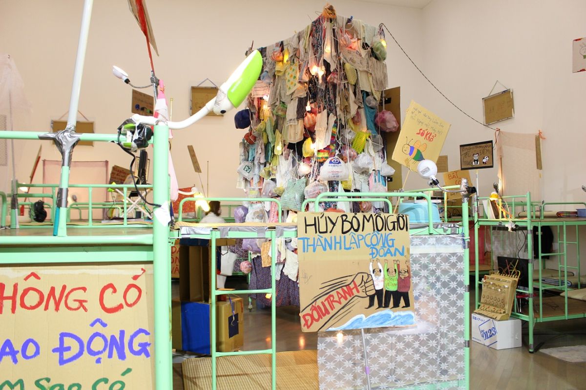 『宿舎』は、2018年に台湾の工場で働くベトナム人女性たちが、待遇改善を訴え寮に立てこもってストライキをした出来事がきっかけで生まれた作品。ストライキの場が、暮らしのなかでみんなが集う広場のように機能したのを見て、二段ベッドで組み立てたセットで、ストライキを再現するワークショップを行ったのだそう。