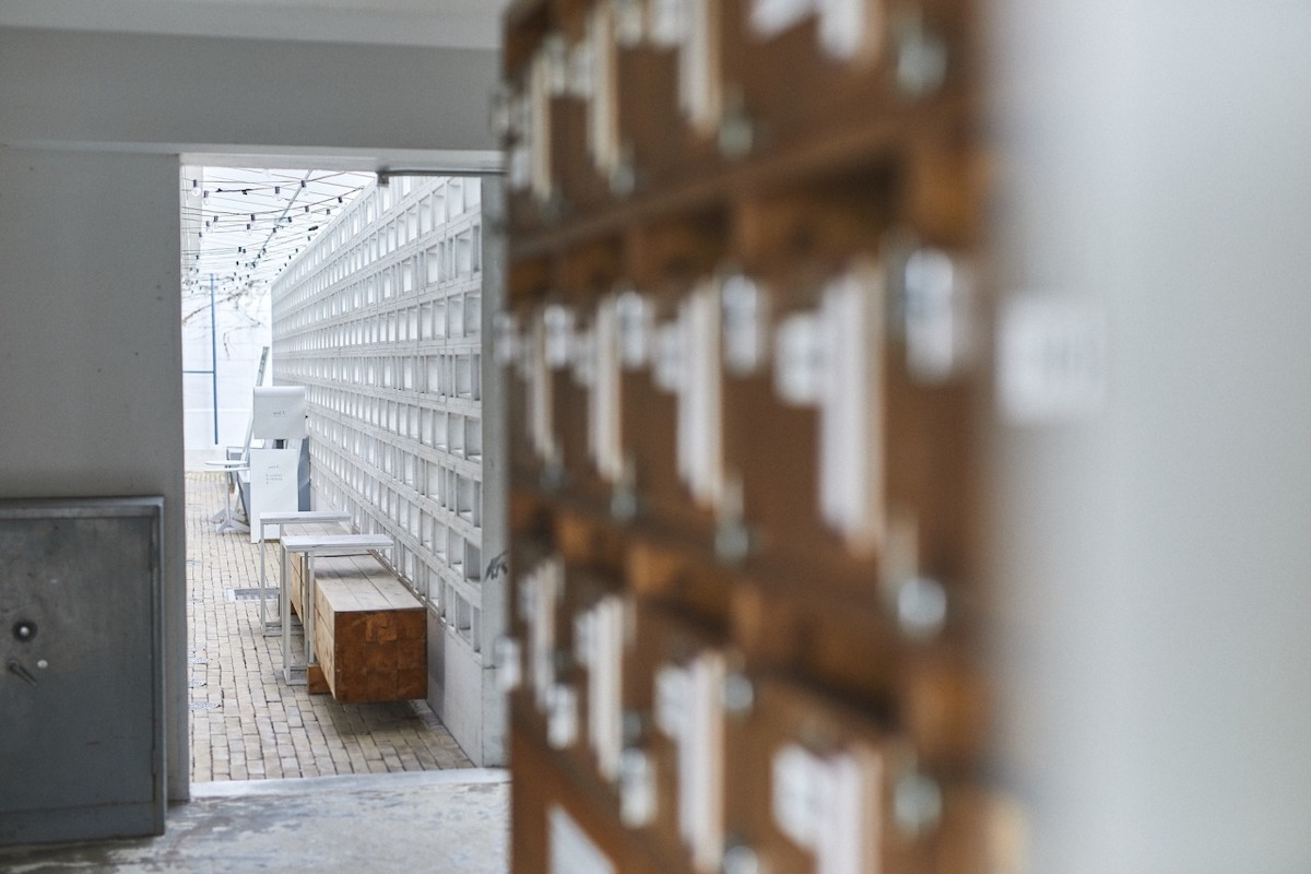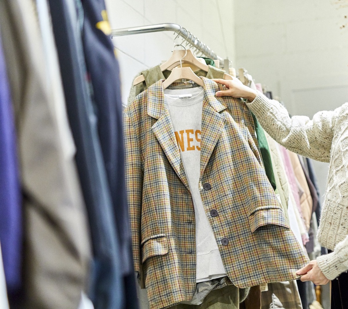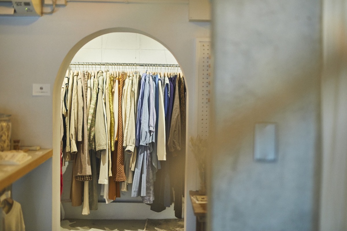 カフェの向こう側、アーチ状にくり抜かれた壁の先には古着屋さんがあります。扱うのは主にヨーロッパの古着。セレクトの基準にしているのは「らしさの透ける、日常の古着。」気をてらわず、その人の個性がさりげなく透けて見えるような普段使いのアイテムを選んで置いているそう。