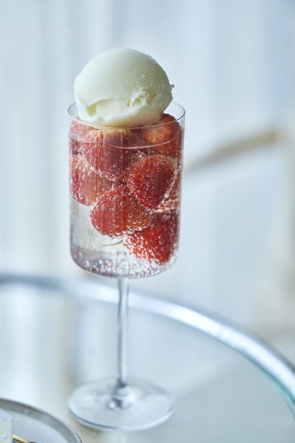 ステアやシェイクなどバーテンダーの技術を使って作るのが、「and C」のドリンクの特長。材料選びも、味の計算も緻密です。通常、クリームソーダの上にのるのはバニラアイスですが、こちらはジンとの相性で選んだヨーグルトジェラート。イチゴも惜しみなくたっぷりと使ってあって、数えてみると10粒入っていました。