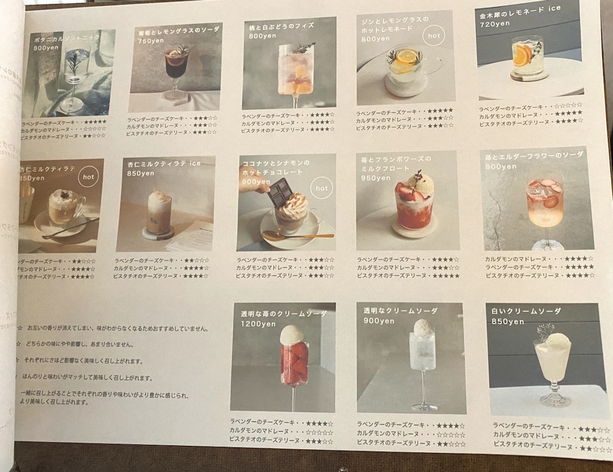 メニューの片隅にはドリンクとケーキの相性のよさが0~5の星で評価してあります。合わないものは「お互いの香りが消えてしまい、味がわからなくなるためおすすめしていません」と正直に書いてあるところが好印象。