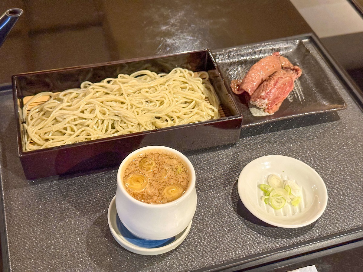 そして、「赤城和牛炙り肉寿司」1皿690円も追加!系列店にお肉屋さんもあるので、本格的な肉寿司を楽しめておいしかった!おそばと一緒に食べてもちょうどよいボリュームなので、一人でいろいろ食べたいときにもぴったりです。