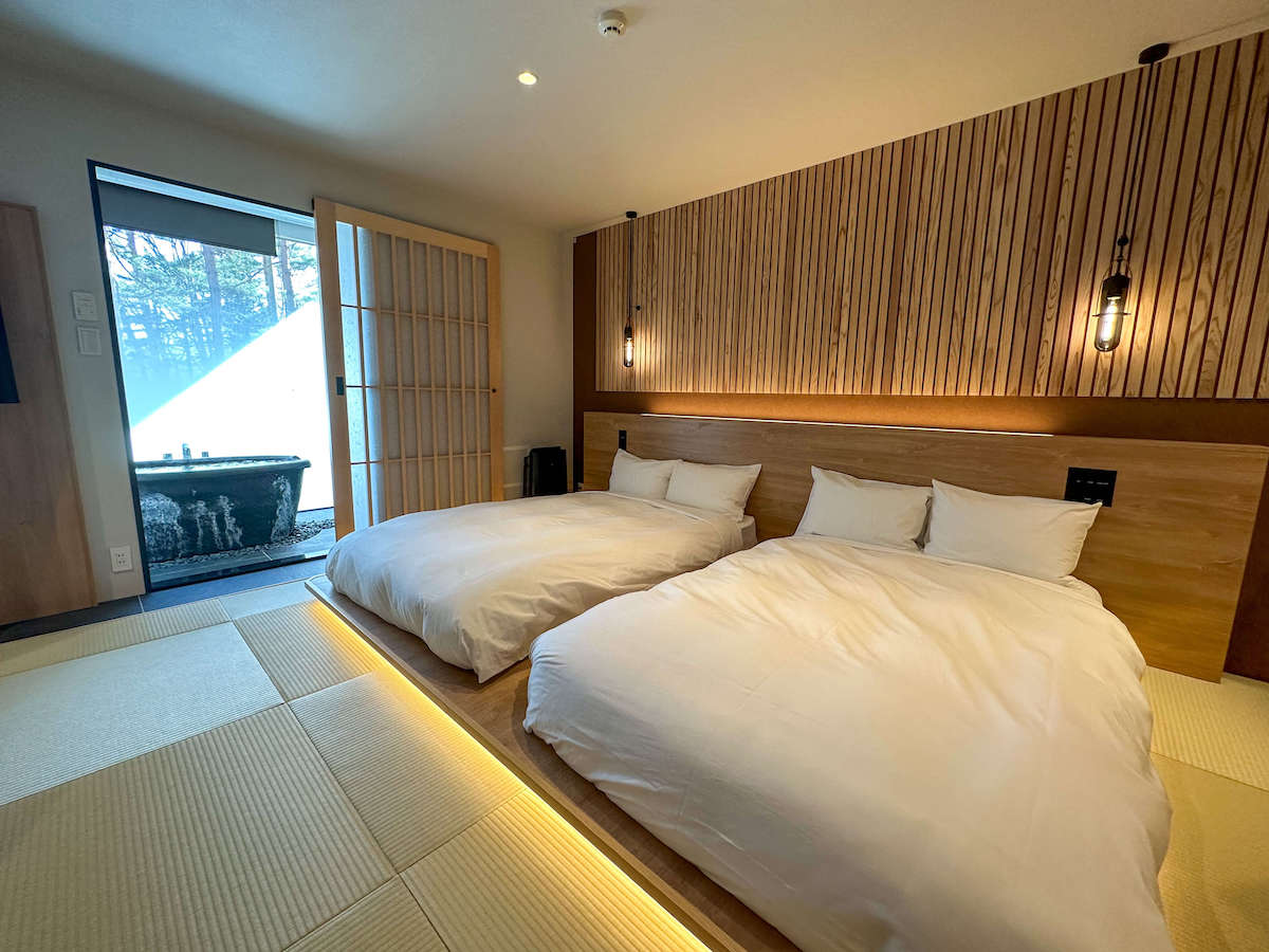 お部屋は温泉半露天風呂付やメゾネットなど、さまざまな客室タイプから選べます。私が泊まったのは木のぬくもりを感じる温かい色調の「温泉半露天風呂付和室ツイン」のお部屋で、ホテルステイもじっくり楽しめました。
