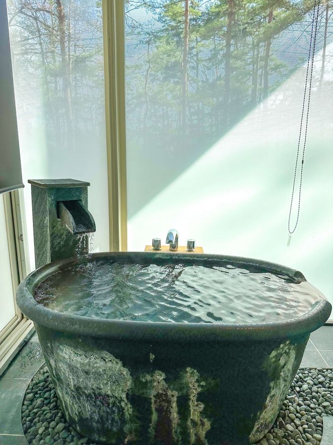 温泉は別荘や一部のホテルでしか入れない希少な「わたの湯」と万代鉱の湯の2種類の温泉が楽しめるんです!露天風呂にアツアツのサウナ、きりっと冷えた水風呂、内湯もあって、思う存分温泉を楽しめました。