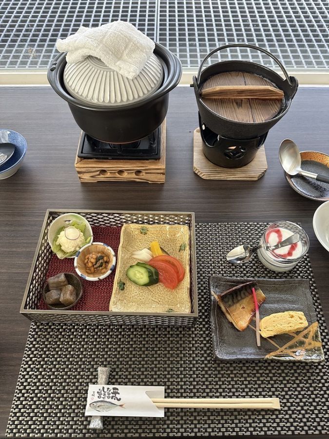 ホテルの朝食も楽しみの一つ。朝食は土釜で炊き上げた岩手県産のひとめぼれと、ご飯に合うおかずがたくさん。