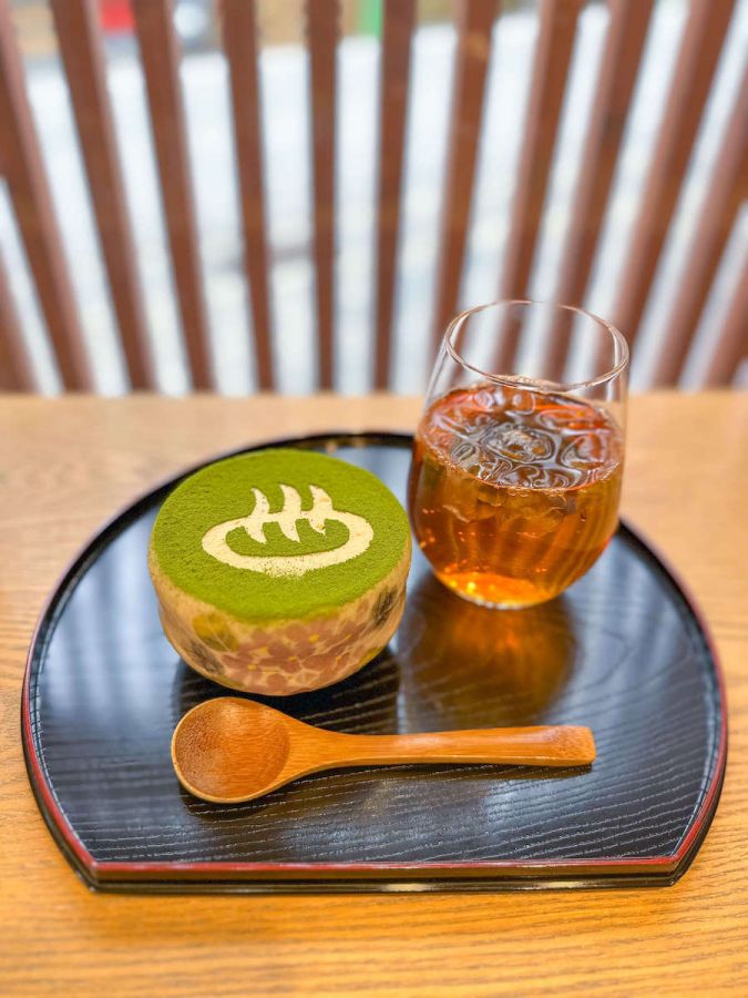 京都の抹茶を使ったかわいい温泉マークが描かれていて、フォトジェニックなデザート。