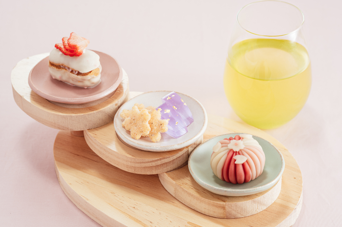 川床テラスでは、春をイメージした上⽣菓⼦、⽺羹を含む4種のお菓⼦を、⾳信川にある⾶び⽯をイメージしたスタンドに盛り付けた「夜桜セット」も楽しめます。