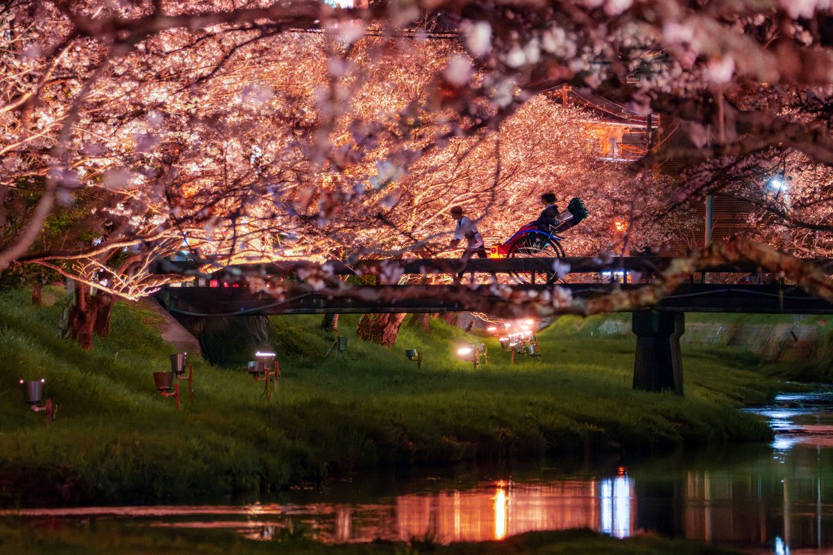 人力車で夜桜を鑑賞したあとは、玉湯川に架かる橋の上の特等席へ。ライトアップされた桜並木が川面に映り込む絶景が広がります。