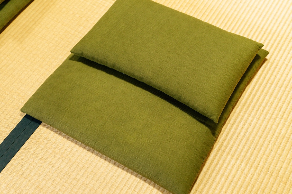 使用する座布団は大小2枚組にするのが臨済宗の基本。自宅で坐禅を組むときには同じサイズの座布団を2枚用意し、片方を半分に折り、折ってないほうの座布団の上に重ねてもOKです。