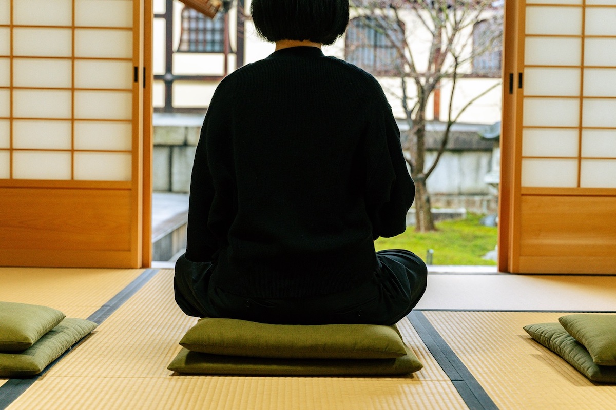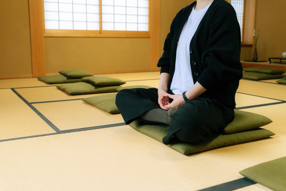 座布団に座り、右の足を左のももの辺りに、左の足を右のもも辺りに乗せて、手は丸を作るようにして静かに組みます。この形でまずは15分じっとします。目は閉じていて構いません。