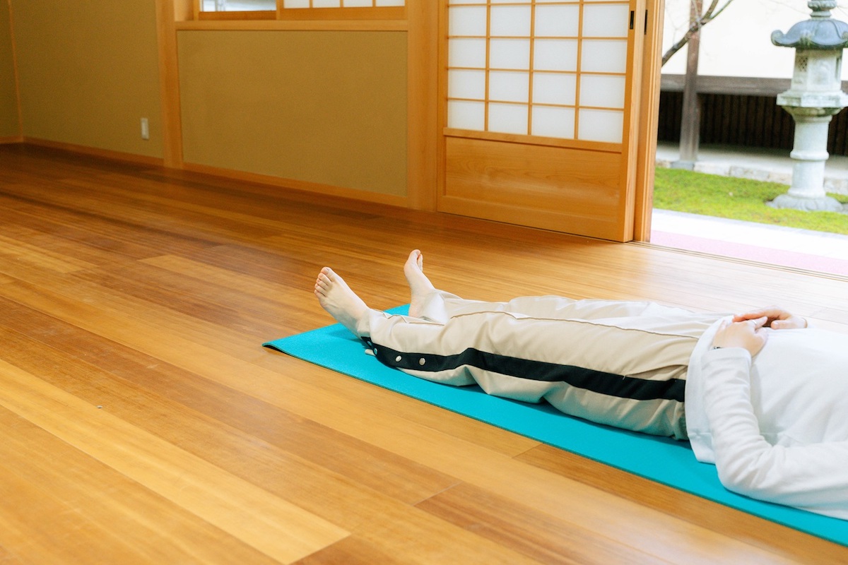 しっかり筋肉を動かした後は、ヨガマットの上でだらんと仰向けに。この日は雨天で少し残念に思っていたのですが、その分、雨音が優しく聞こえてきて、心も体も癒やされました。