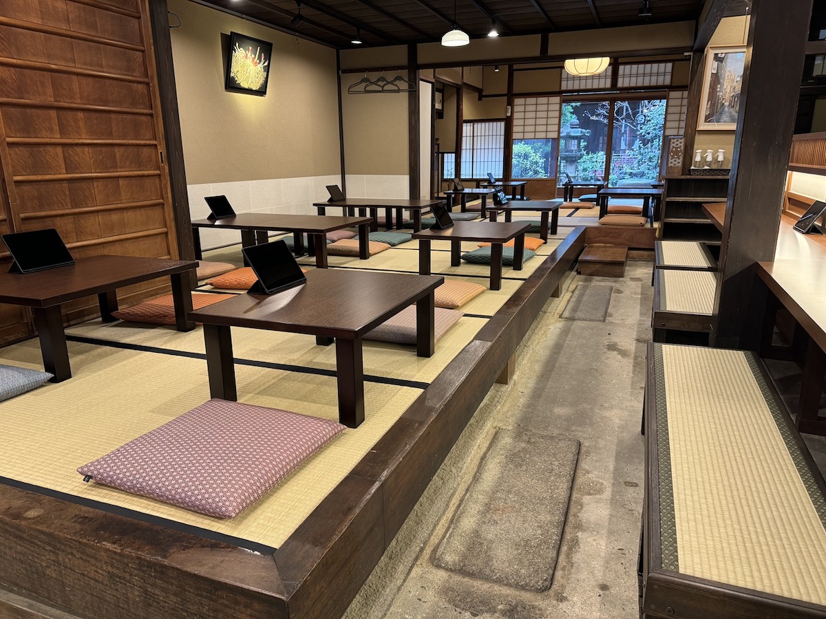 のれんをくぐって店内へ足を踏み入れると、一段上がった座敷席が目に入ります。店の奥には中庭もあり、京都らしさを感じられる空間がすてき。入り口近くにはお茶を点てるときに使う囲炉裏もあります。