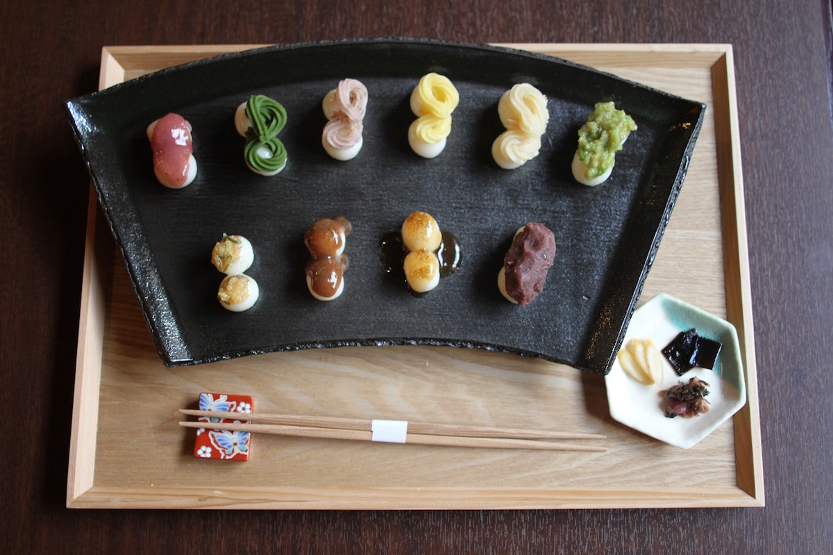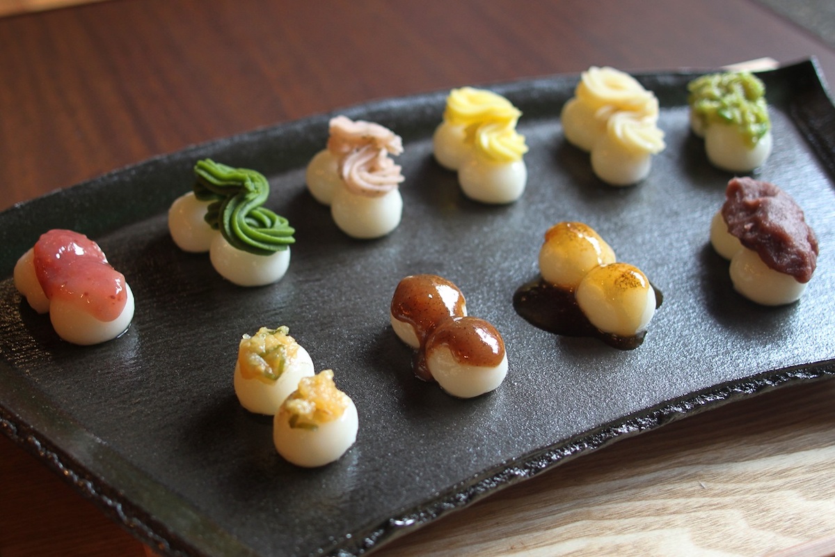 また、こちらの「十種の味わい団子膳」1320円も人気メニューのひとつです。「京都小倉餡」をはじめ、「厳選宇治抹茶餡」「西京白味噌餡」「九条ねぎ味噌」など京都の素材を使った餡がトッピングされた団子は、バラエティ豊かな味がラインアップ。箸休めとして、自家製昆布とお漬物2種がセットになっています。