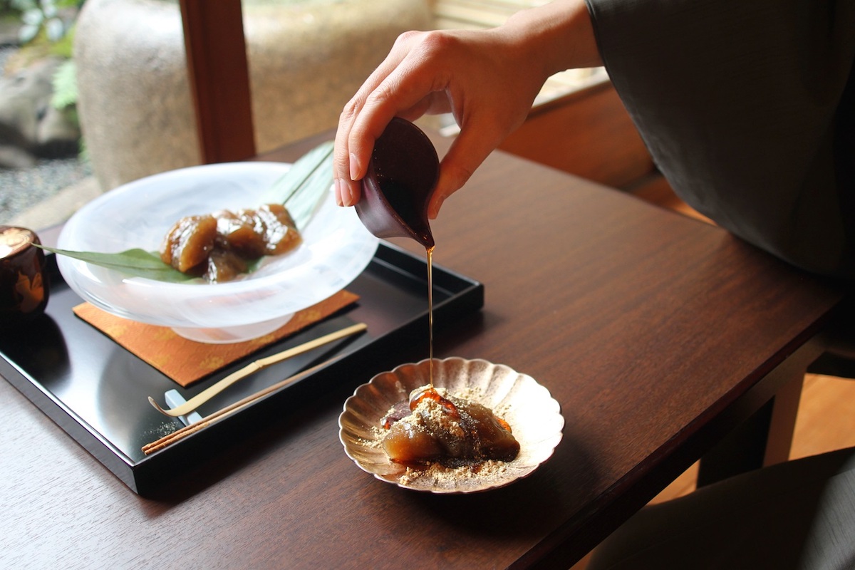 作りたてを提供されるので、わらび餅がほんのり温かいのも特徴のひとつ。食べるときは、丹波黒豆のきな粉と、沖縄の波照間産黒糖の黒蜜をたっぷりとかけていただきましょう。わらび餅ときな粉、黒蜜それぞれの甘みが絶妙に重なり合い、一度食べればやみつきになること間違いなしです!