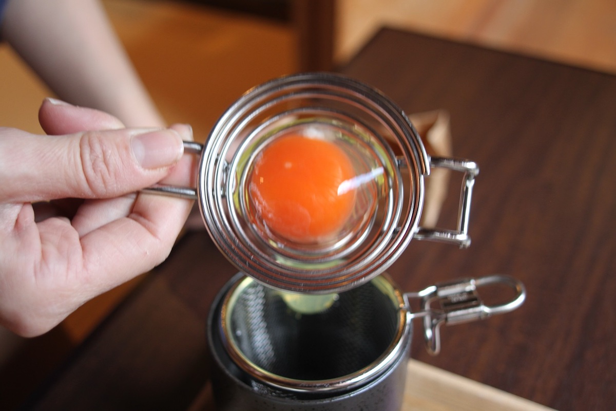 特徴的なのは、その食べ方。まずは専用の器具を使って、卵をサラサラの卵白とトロトロした卵白、卵黄の3つにわけます。使用している卵は、京都産の「平飼い卵」。うま味とコクが濃厚で、卵黄の色もとても濃い色味をしています。