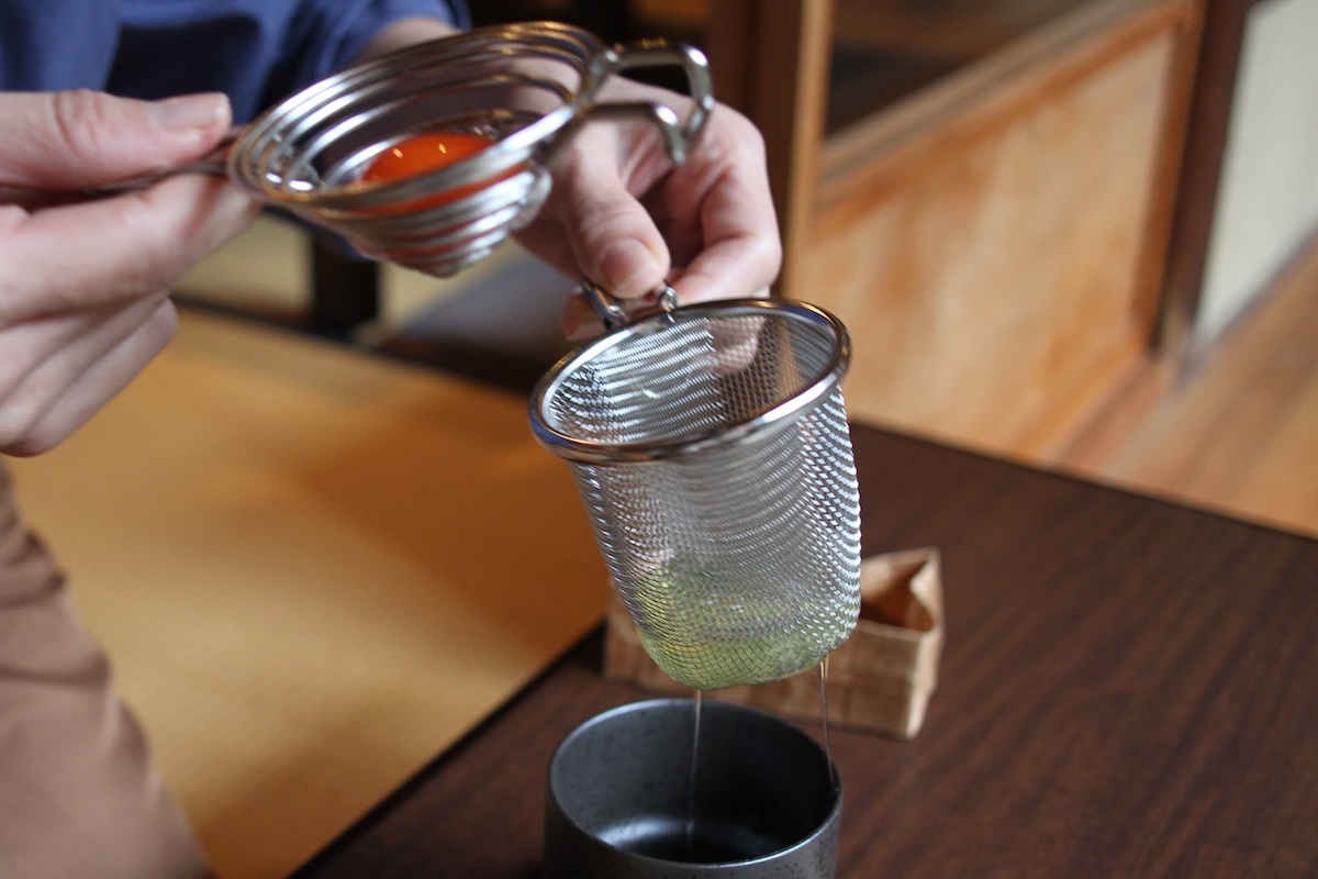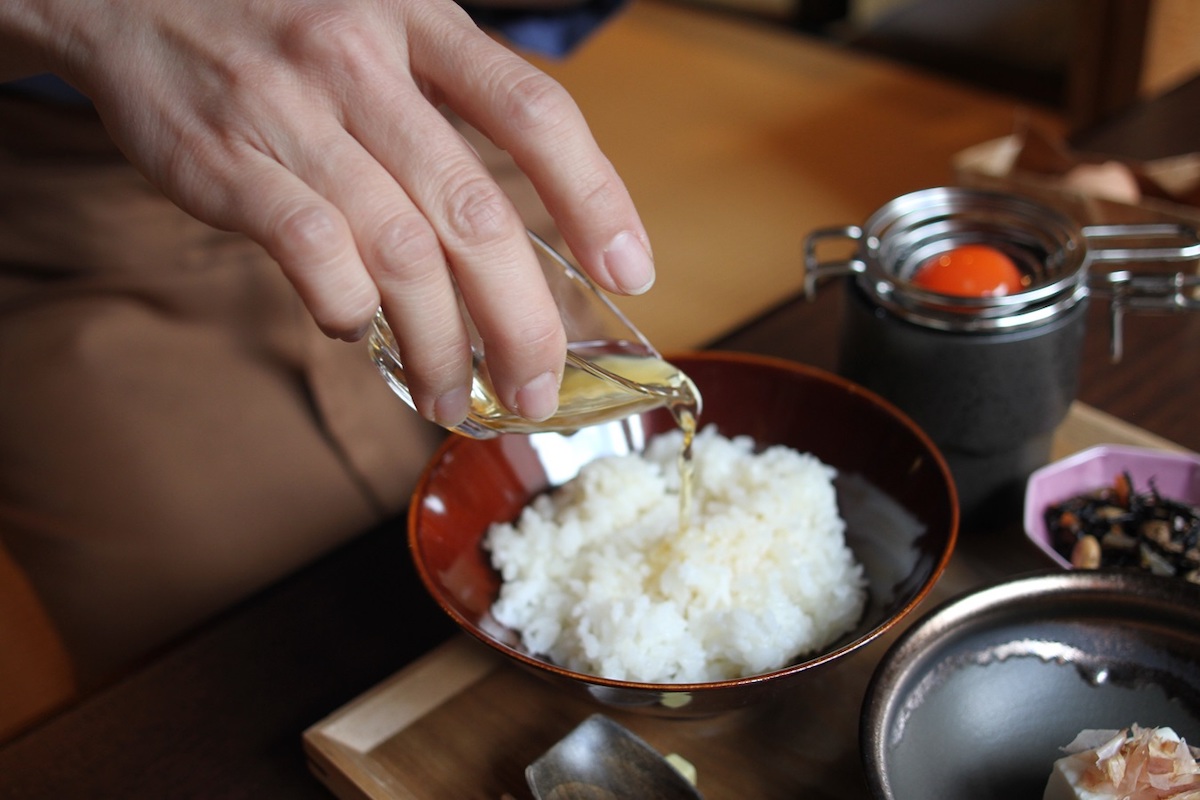 続いて、京都の蔵元「佐々木酒造」の純米酒と梅干し、かつお節などを煮て作られた店内仕込みの「煎り酒」をご飯にたっぷりと注ぎます。「煎り酒」は、江戸時代中期ごろまで庶民に親しまれていた調味料で、醤油が普及する前に使われていたそう。この「煎り酒」が卵のうま味をより引き立ててくれます。