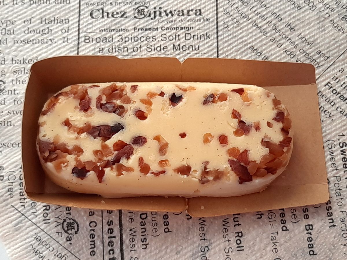 厚紙のトレーにのっていて、ワンハンドで食べられるように、厚紙は半分のところで折れるようになっています。表面の黒い点々は、マダガスカル産バニラシード。大きさは幅4cm、長さ9cm、厚さ1.5cmほどです。