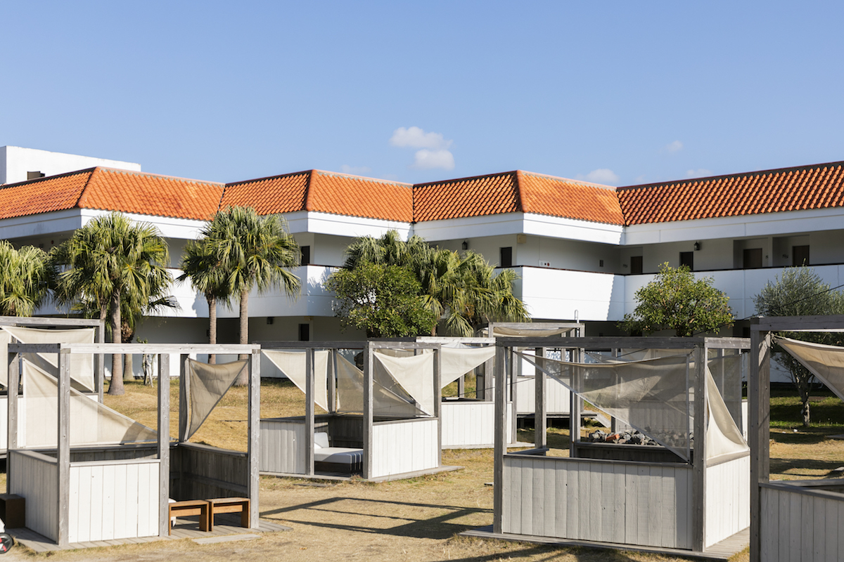まるで外国に来たような南欧風の建物はリゾート感たっぷり。敷地内には6つのホテルがあり、ナギホテル、カゼホテルのあるガーデンエリアにはかわいいカフェやカバナ、ハンモックなどが設置され、宿泊者は自由に利用できます。のんびりお昼寝したら気持ちよさそう。