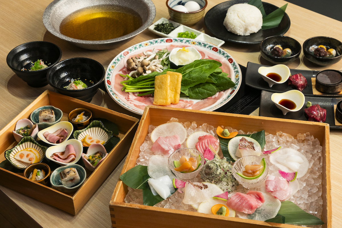 夕食はレストランで宿泊者専用のディナーをいただきます(写真は一例、2名分)。全体の味付けがとても上品で、新鮮なお刺身はまさに島ならでは!上質な豚肉のしゃぶしゃぶも絶品でした。暖かい季節はオープンエアーのデッキで楽しめるバーベキューも人気です。