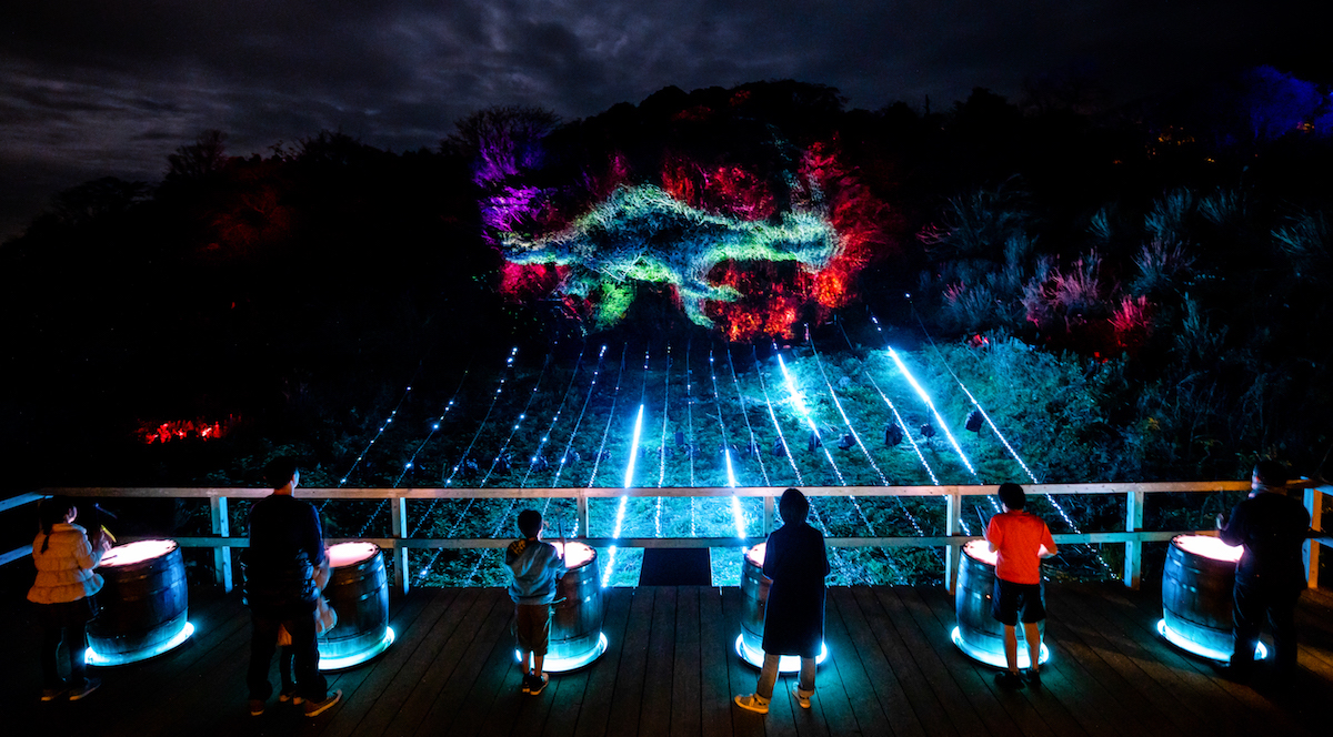 夜の楽しみはもう一つ。専用バスに乗って、伊王島の大自然をステージに繰り広げられる光と映像のナイトアドベンチャー「アイランドルミナ」へ。ゲートに着いたら、そこからは広大な森を歩いて散策。夜風を感じながら、ファンタジーとイルミネーションに彩られた幻想的な世界で非日常を体験できます。