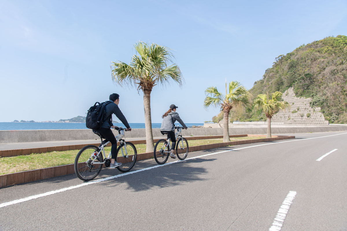 翌朝は、ホテルをチェックアウトして島巡りへ。小さな伊王島には信号も無く、比較的車も少ないのでサイクリングがおすすめ。特に「i+Land nagasaki」のレンタサイクルは宿泊者無料。海沿いの観光ロードや自転車専用ロードは眺めもよくてサイコーです。