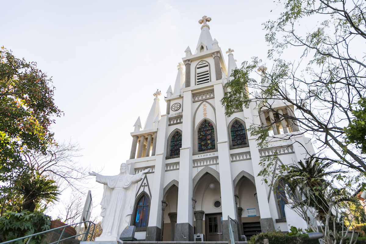 まずホテルから近いカトリックの「馬込(まごめ)教会堂」へ。潜伏キリシタンの歴史を秘めた歴史ある教会で、造りはゴシック様式。堂内の天使像やステンドグラムからの光が幻想的で、神聖な空気が漂っています。