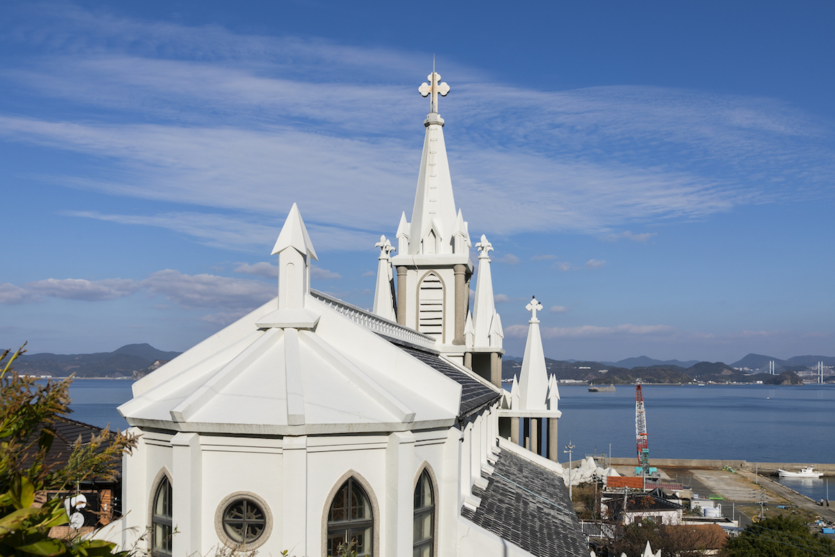 教会の裏から見る景色もステキ。遠くに望むのは長崎。行き交う船の姿と教会の鐘の音が心を癒してくれます。