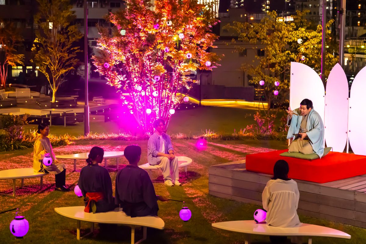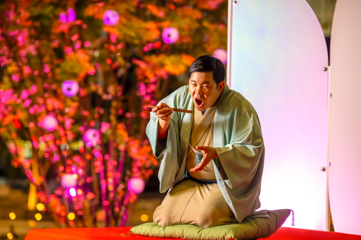 毎晩、19時30分~20時には広大なガーデンエリア「みやぐりん」で、春にまつわる上方落語が披露されます。高座に上がるのは、落語芸能事務所「米朝事務所」の落語家たち。桜色に彩られた幻想的な空間で、落語が楽しめます。