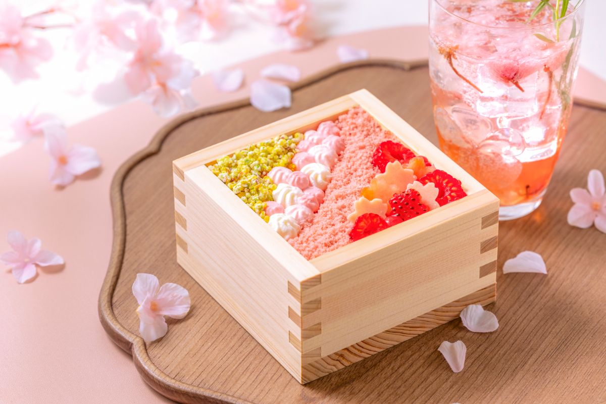「桜と冷やし飴のムース」1500円は、桜のスポンジと冷やし飴を使⽤したムースで構成した数量限定のスイーツ。升を器にし、上にはイチゴやフランボワーズ、ピスタチオ、桜メレンゲがトッピングされていて、目でも舌でも春を感じられるスイーツになっています。