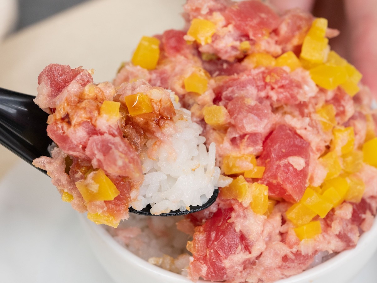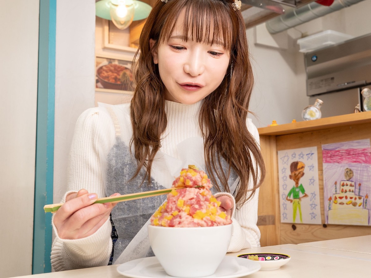 もえあずのイチオシはコチラ!マグロのすき身とマグロのブツ、そしてたくあんの豪華競演が楽しめる「トロたく映え丼」です。