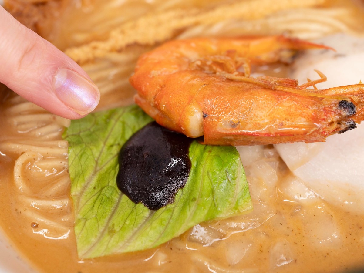 ソフトシェルシュリンプや鶏チャーシュー、軟らか穂先メンマ、自家製海老パウダーなどの具材もラーメンに彩りを添えます。