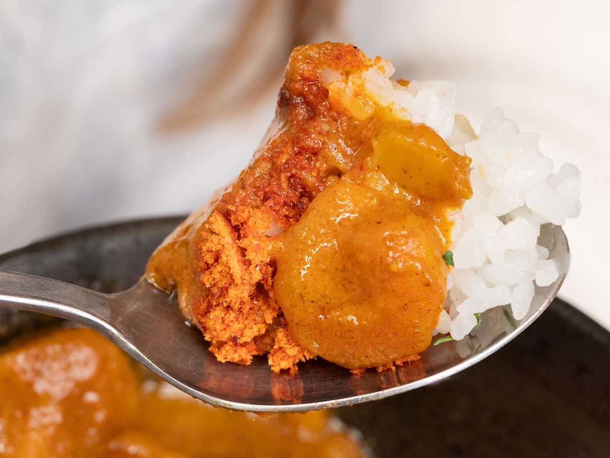 濃厚ビスクベースのカレールーとライスの境目にかけられたオレンジ色の粉末は、甘エビや赤エビを粉砕して作ったエビの粉末。これがあることでエビの香りと口の中に広がるうま味が半端ない!