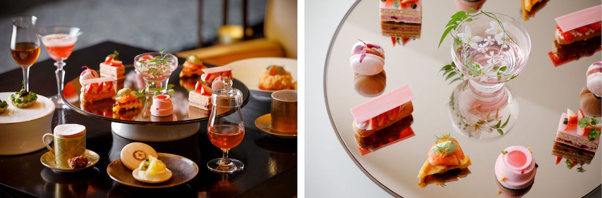 非日常なひとときが過ごせるラウンジ「ザ リビングルーム」では、アフタヌーンティーとともに、お花見気分が味わえます。一品ずつ繊細に仕上げたセイボリー・スイーツをアソートスタイルで楽しめるブロンズミラーのティースタンド。この時期ならではの優美なアフタヌーンティーです。