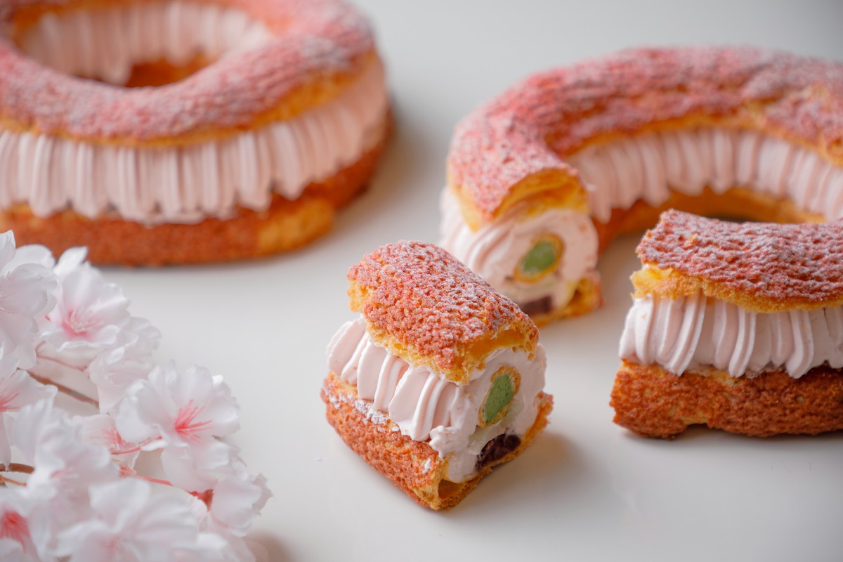 ランチ、ディナーコースの最後は、桜のシャンティ―クリームを愛らしく飾った「桜のパリブレスト」。リング型のシュー生地の中には、たっぷりの桜クリームと甘さ控えめの粒餡、求肥が入っています。あしらった桜の塩漬けの塩味と甘みのバランスが絶妙のおいしさです。
