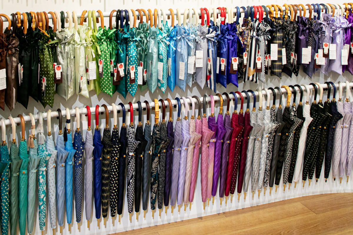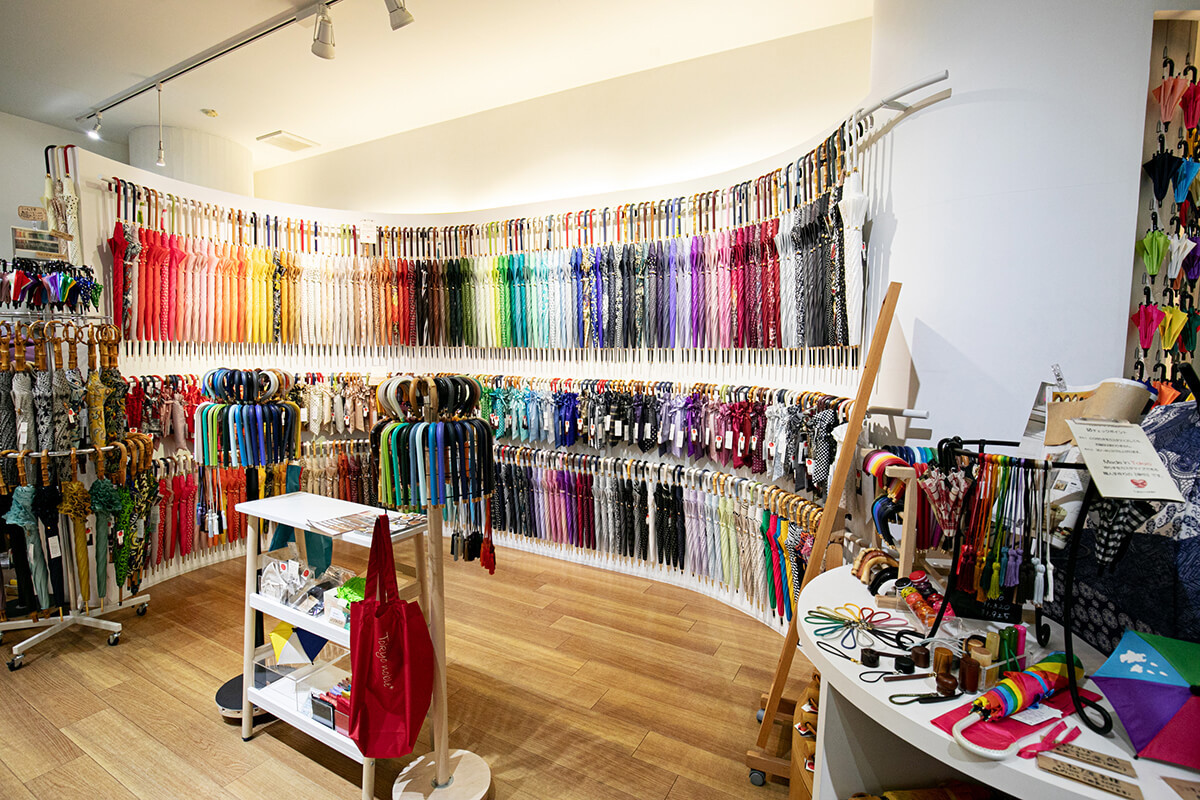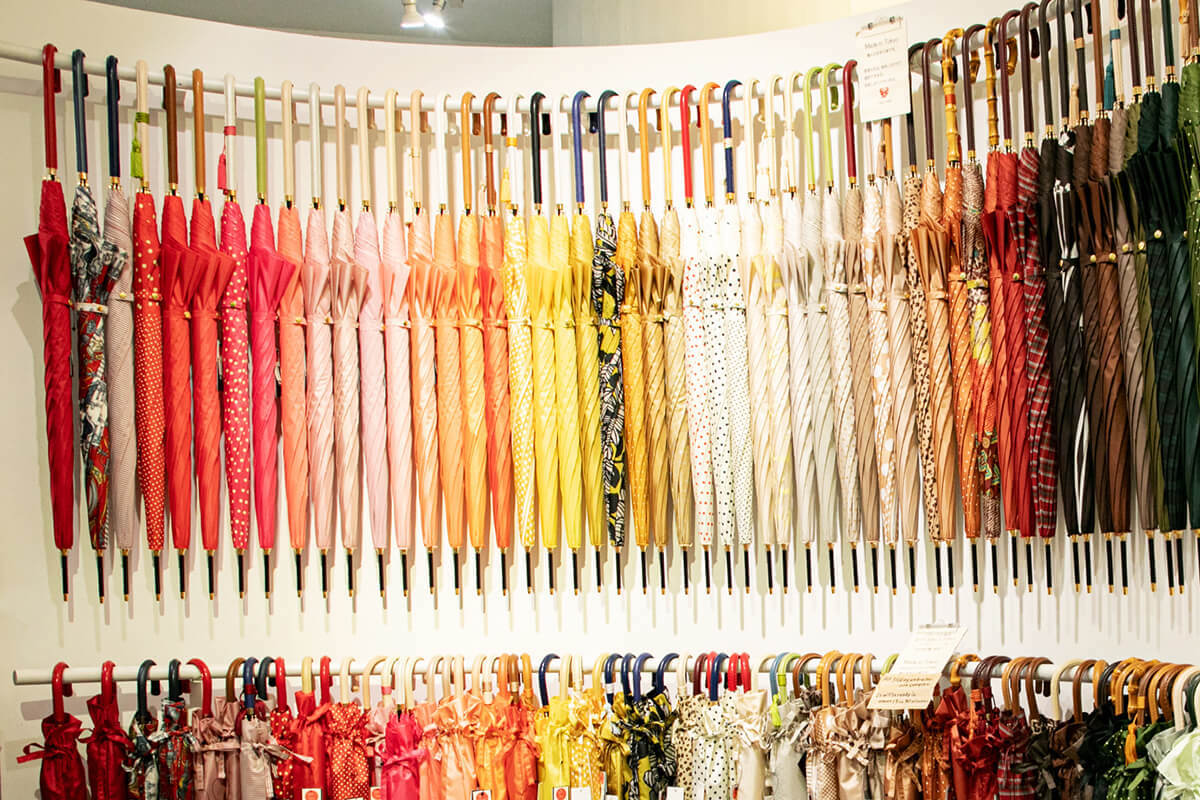 「Tokyo noble」では、約77種類の色柄から好きな生地を選んでセミオーダーの傘を作ることができます。店内に入ると目の前にずらりと色とりどりの傘が並んでいて、その様子は圧巻です。こちらの傘は、すべて丁寧に製作されたメイドインジャパンのもの。現在流通している傘のほとんどは中国で大量生産されているもので、日本製の傘はわずかだとか。現在では、日本に傘職人は少なくなっているそうです。