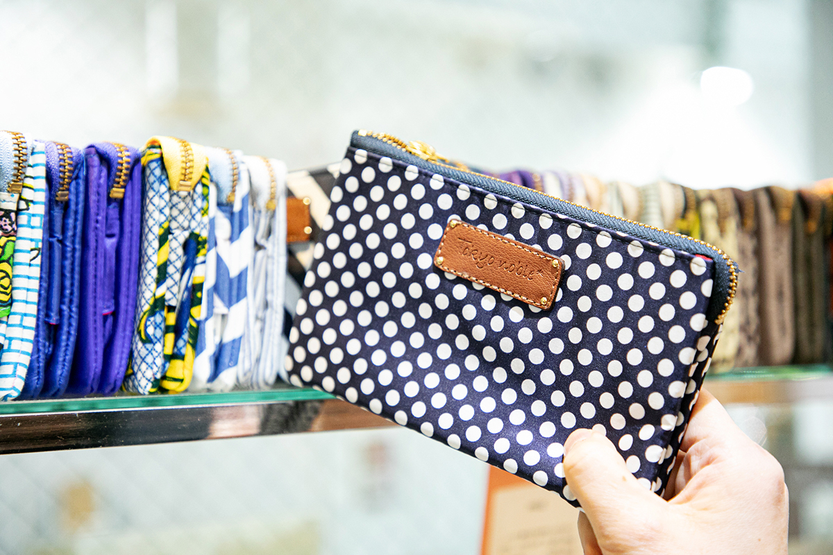 こちらは、傘の生地で作られている「お財布」4950円〜。通帳なども入る便利な大きさで、ポーチ使いもできるそうです。セミオーダーしたものと同じ柄があればお揃いで買ってしまいそうですね。