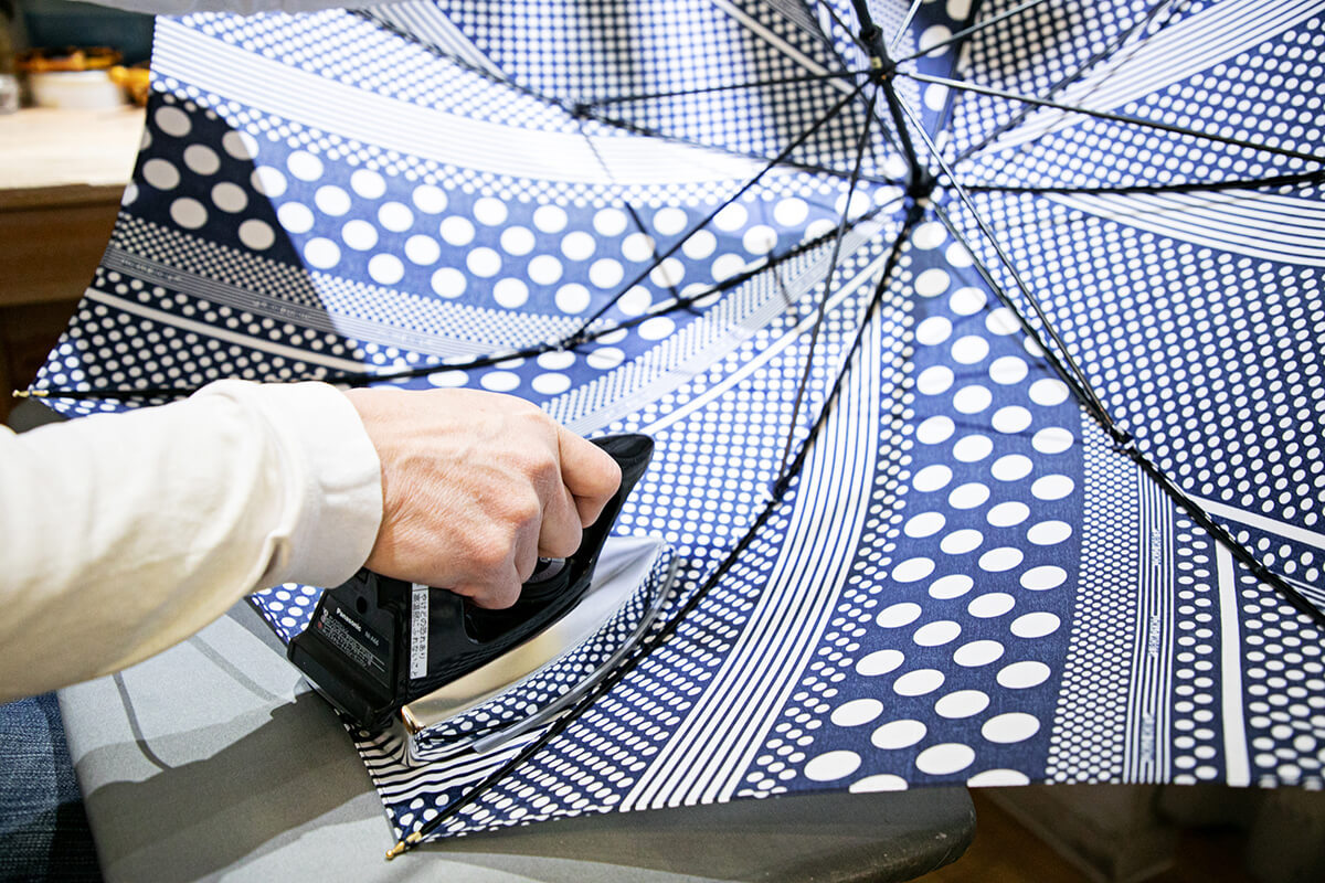 お店に戻ると、仕上げに傘へアイロンをかけているところでした。こちらは職人ならではの技なので、自宅で傘にアイロンをかけるのはおすすめしない、とのこと。傘にアイロンをかける理由は、「少しでもシャキッとした状態で傘を使って欲しいから」だそう。こんなに丁寧に作られた傘だと、愛着も湧きますよね。