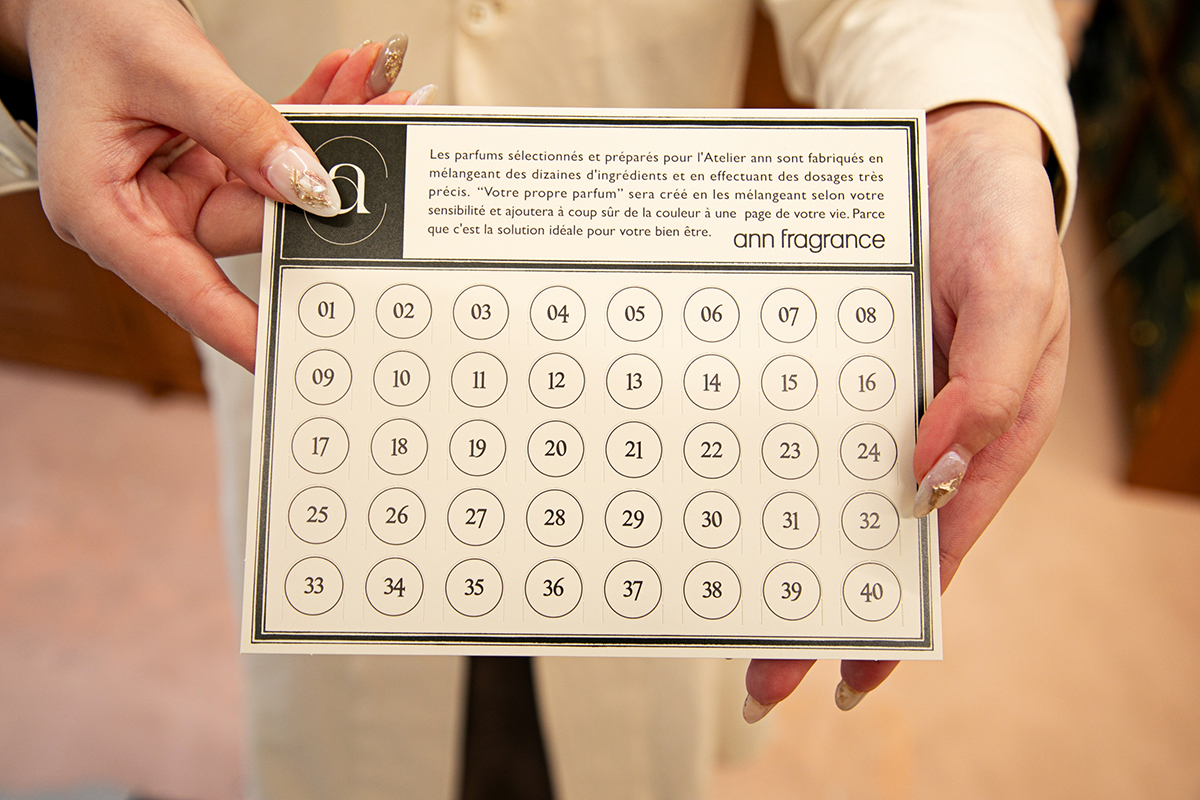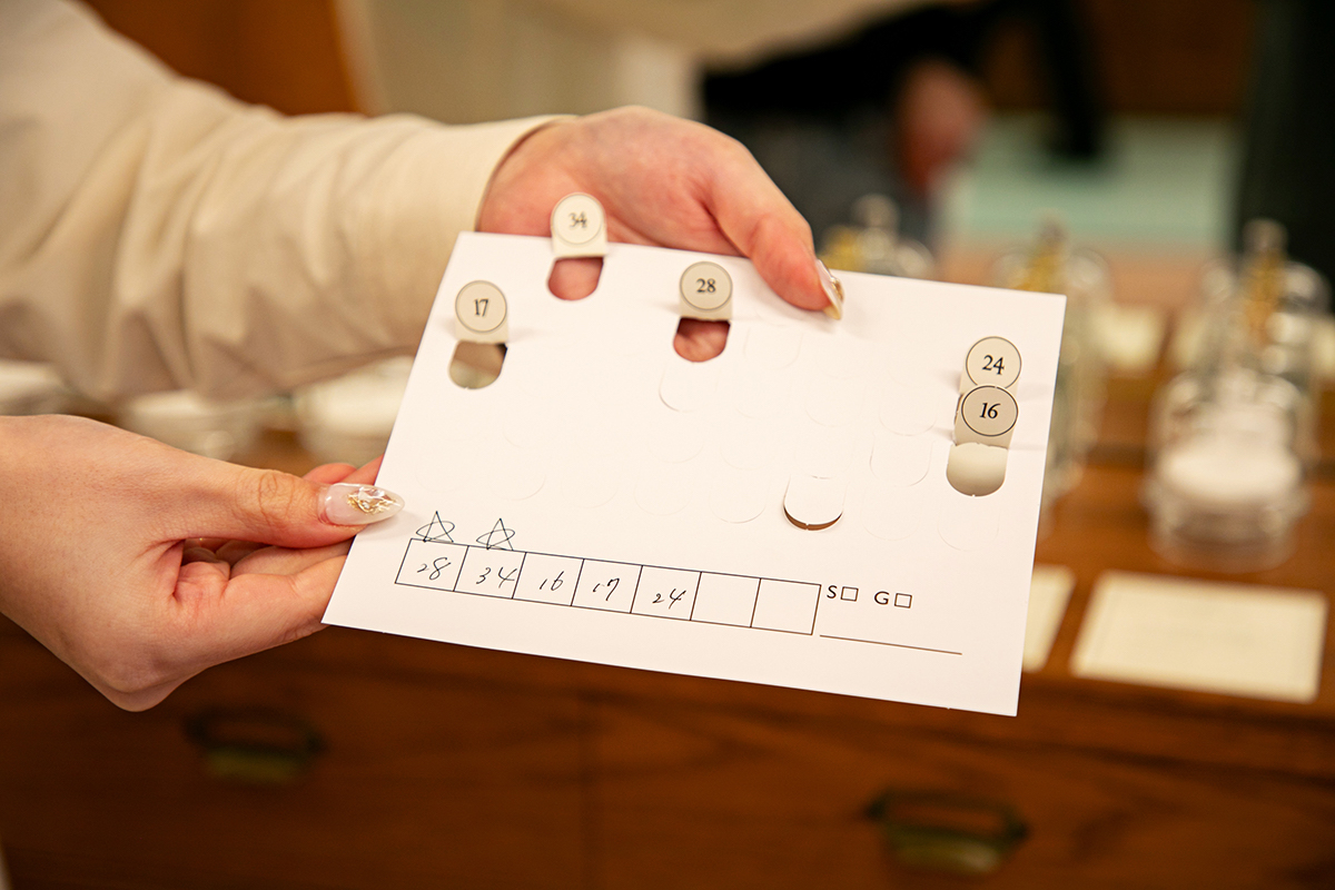 調合師から、こちらのビンゴカードを手渡されました。このビンゴカードを使いながらひとつひとつ香りを嗅いでいき、いいと思った香りの番号をすべて折り曲げていきます。